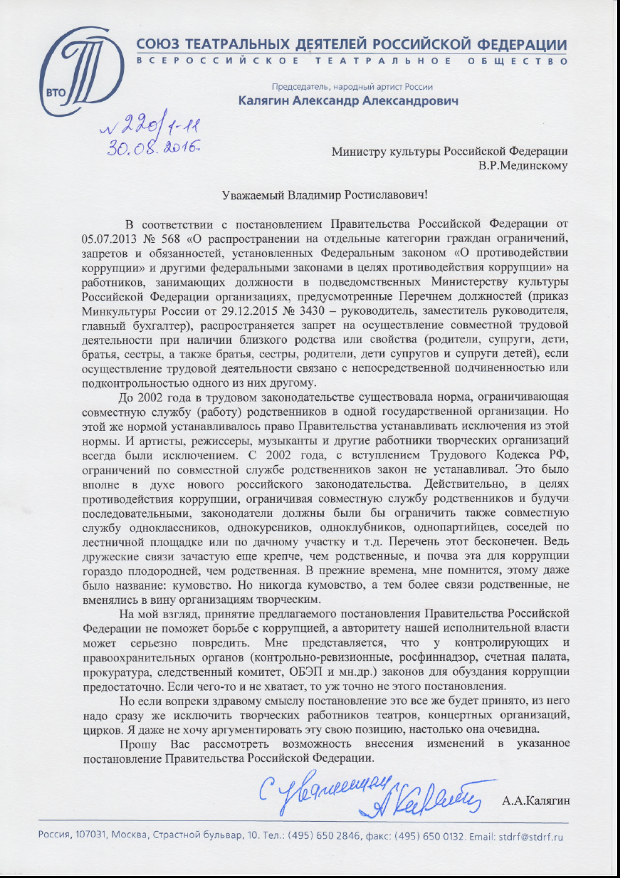 Председатель СТД РФ Александр Калягин направил Министру культуры РФ Владимиру Мединскому письмо, в котором выразил свое мнение и мнение всего театрального сообщества относительно изменений в Постановлении Правительства Российской Федерации от 5.07.2013 года №568, которые вступили в силу 9 июля 2016 года. В соответствии с данными изменениями руководители организаций культуры не смогут работать вместе с сотрудниками организации, с которыми они находятся в близком родстве. (Подробнее об этом - в публикации "Комсомольской правды" от 2 сентября 2016 года http://www.kp.ru/daily/26576/3592081/) Предлагаем Вашему вниманию текст письма Александра Александровича.
