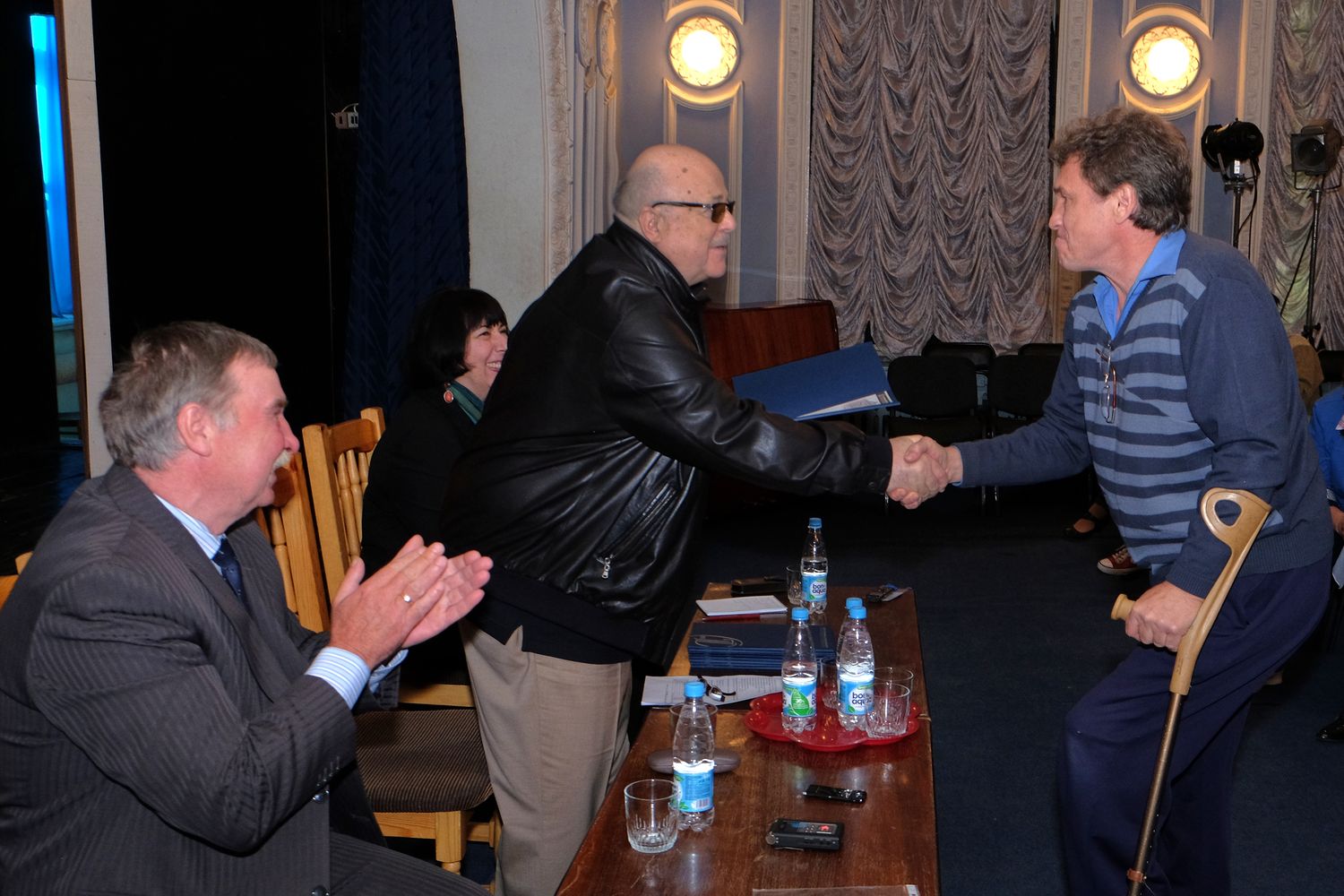 Из Хабаровска А.А. Калягин прилетел в Иркутск, где 10 сентября спектаклем «Шейлок» У. Шекспира здесь откроются гастроли театра Et Cetera. 9 сентября в Доме Актера Калягин встретился с театральной общественностью Иркутска. Он рассказал о том, как прошел театральный форум в Хабаровске, об итоговом документе, который должен быть подготовлен по результатам работы форума. Руководитель Иркутского отделения СТД РФ Владимир Орехов рассказал о тех проблемах, которые волнуют иркутчан, в частности, о необходимости реконструкции Дома Актера. Встреча проходила в форме диалога, А.А. Калягин слушал коллег, записывал вопросы, которые надо взять под свой контроль. Прозвучали на встрече и слова благодарности в адрес СТД РФ и А.А. Калягина – кто-то поделился своими впечатлениями о Доме ветеранов им. М.Г. Савиной, который стал настоящим дворцом, кто-то благодарил за помощь, оказанную после операции, кто- то за проект «творческая командировка» и возможность приехать в Москву и т.д. А сам Калягин поблагодарил всех за замечательную работу и вручил благодарственные письма СТД РФ.